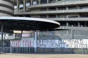 就在国米惨败的第二天,米兰球迷就在圣西罗球场外挂出了嘲讽国米的横幅,写着:“0个冠军。昨天伊斯坦布尔,今天慕尼黑,明天大家一起看心理医生。”